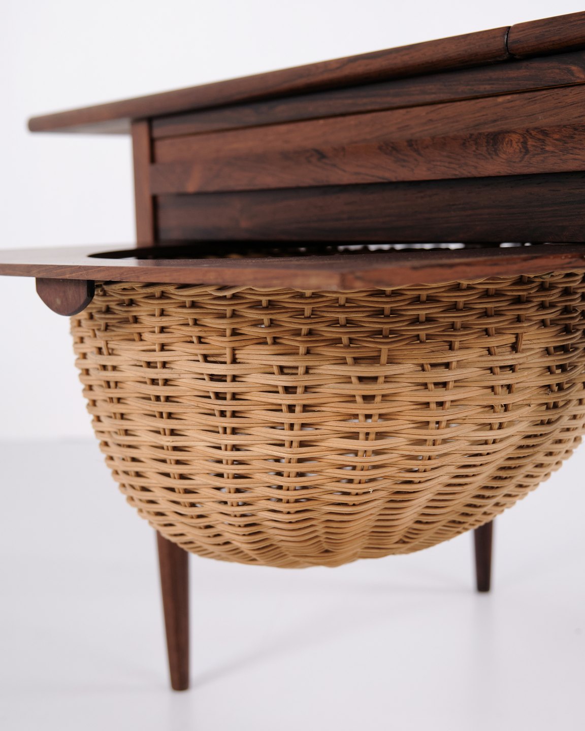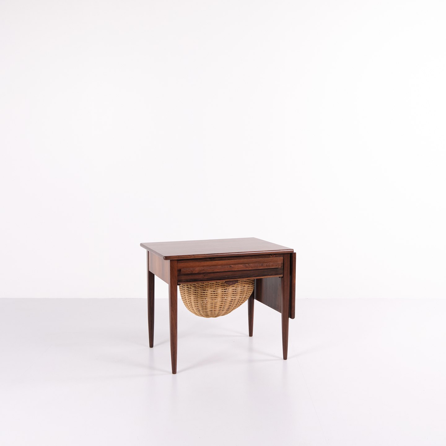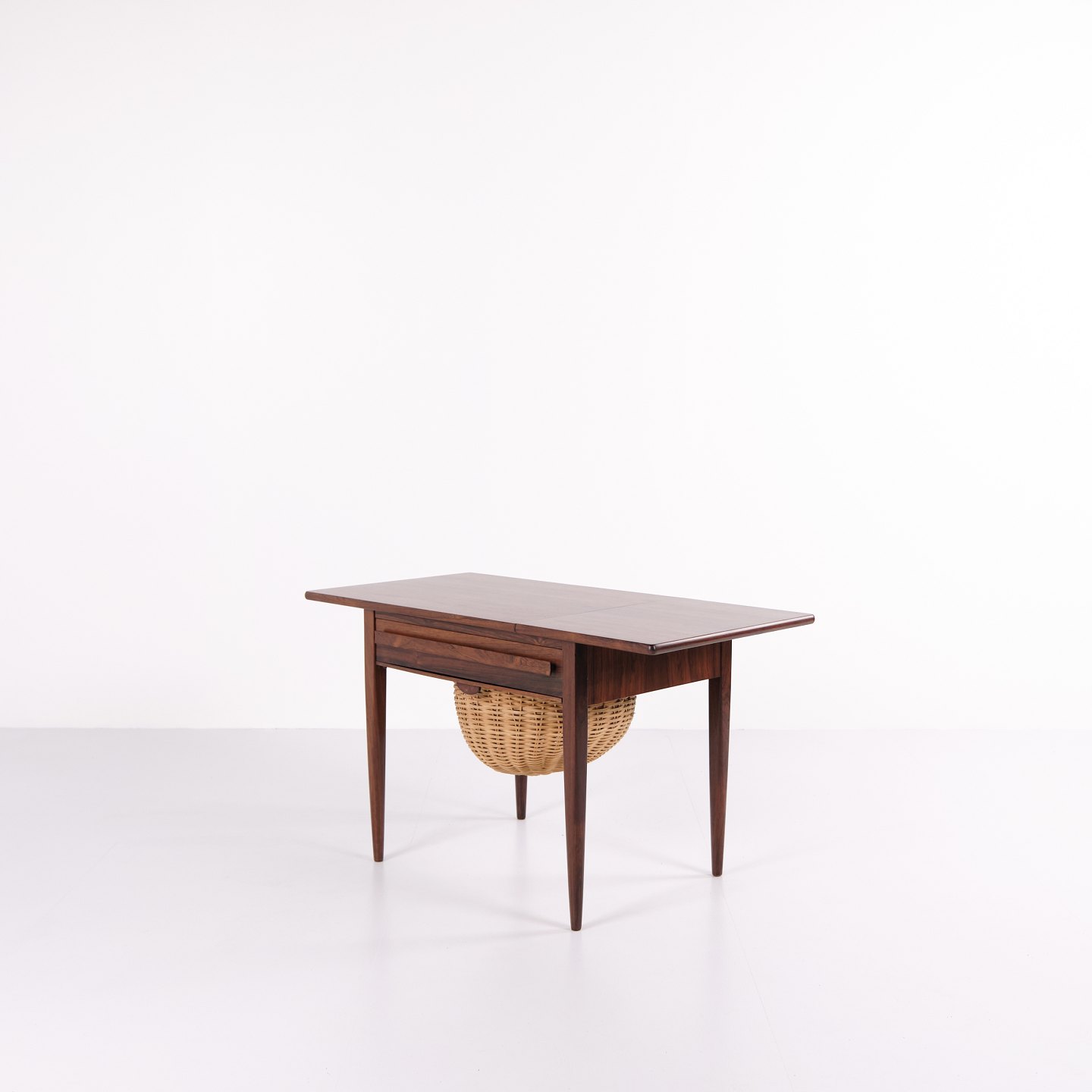Foldbart sybord designet af Johannes Andersen og fremstillet af Silkeborg Møbelfabrik i 1960’erne. Bordet er udført i palisander og har både skuffe og udklappelig bordplade, hvilket gør det særligt funktionelt til opbevaring og arbejde.