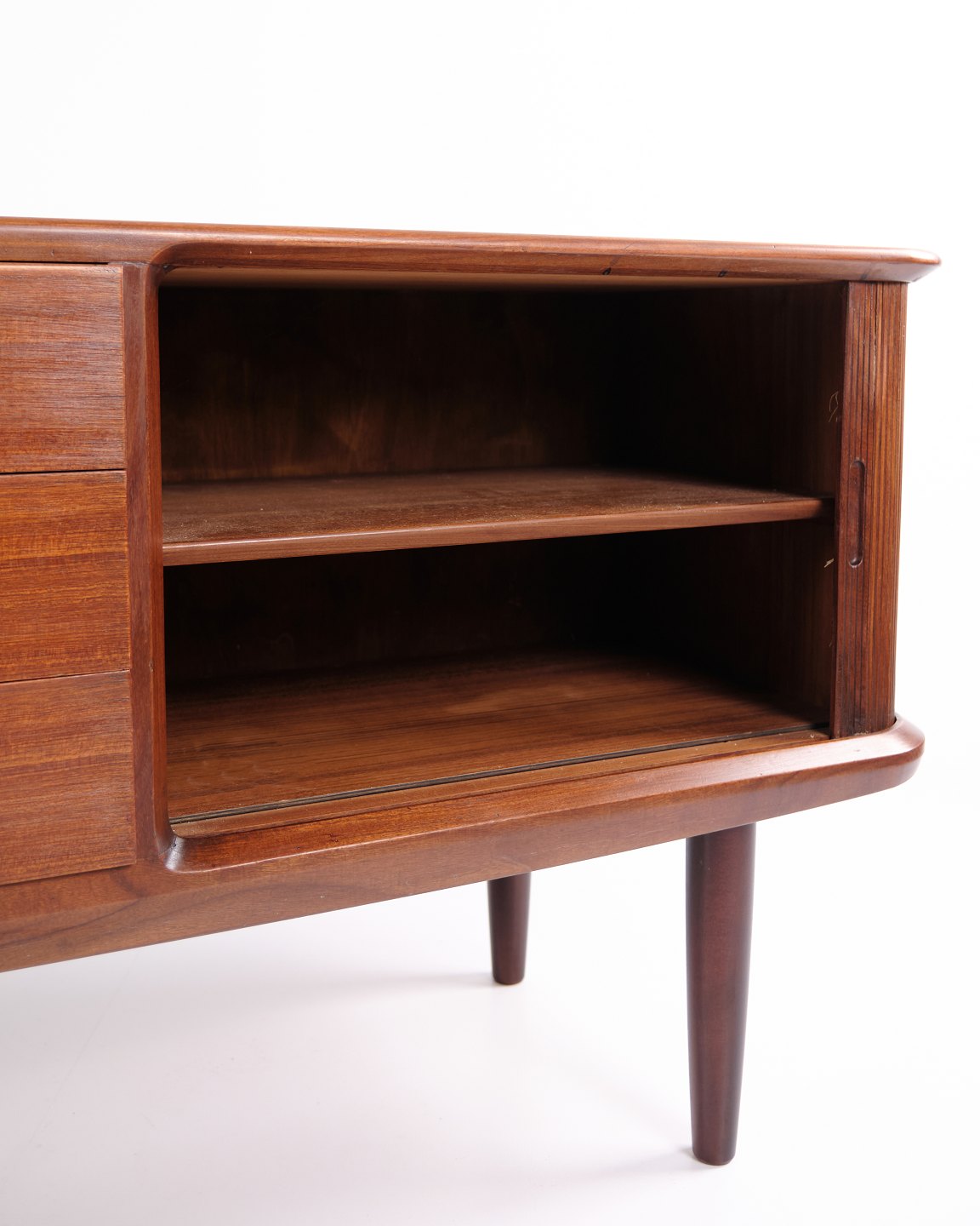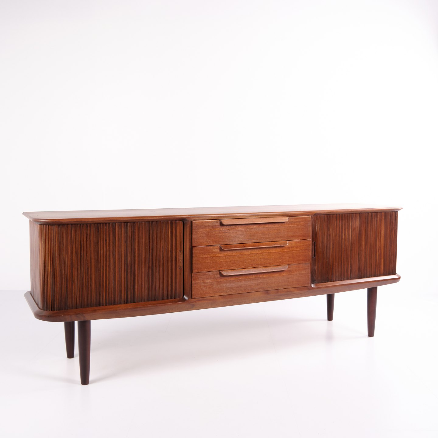 Kontakt os vedrørende prisSkænk fra 1960’erne, udført i teaktræ med tre centrale skuffer og jalousilåger i siderne.