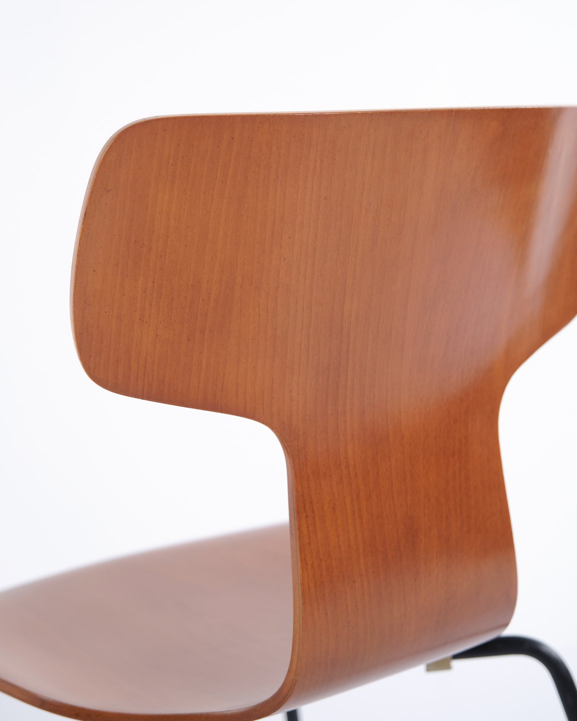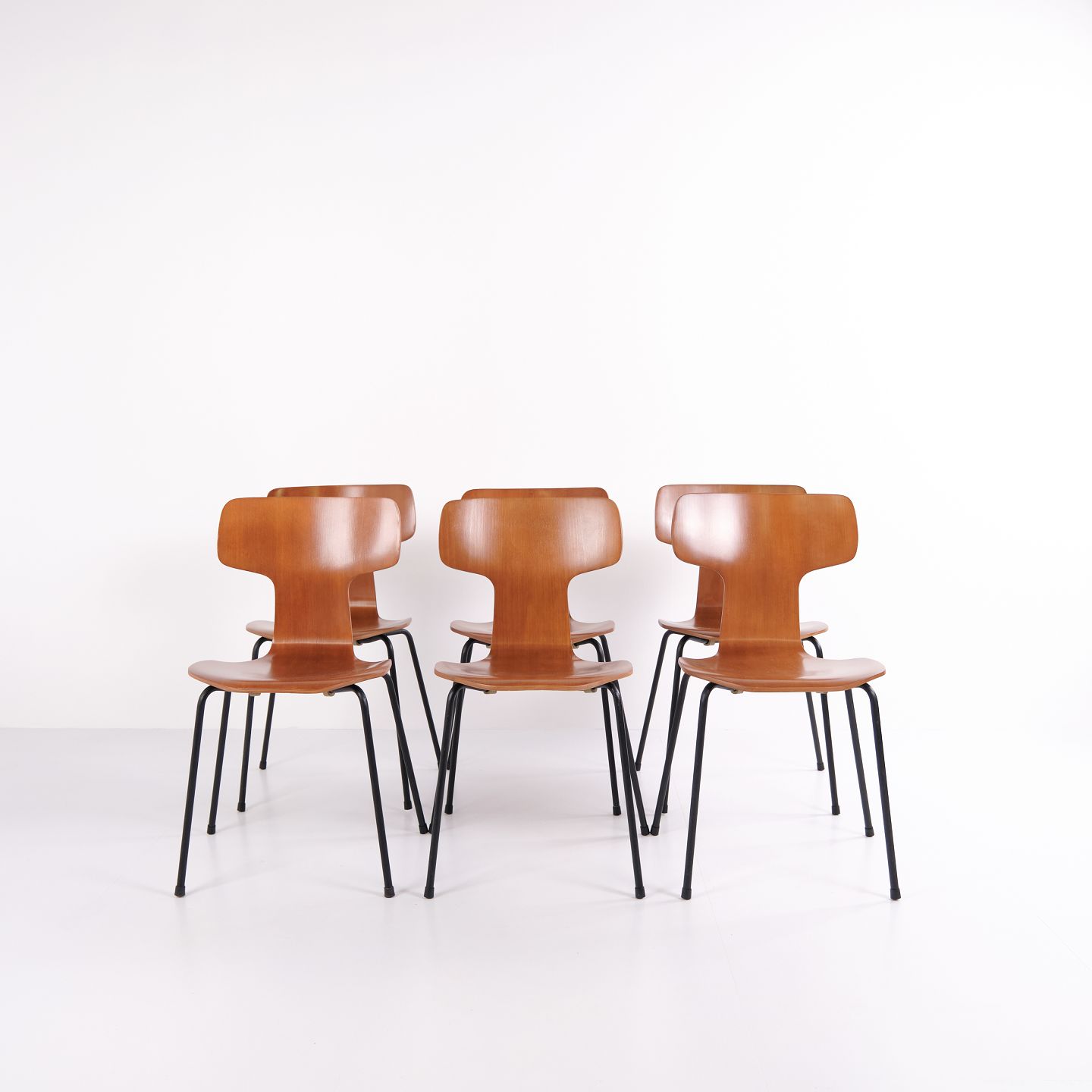 Sæt af seks spisestuestole, model 3103, også kaldet T-stolen eller Hammerstolen, fra Fritz Hansen. Stolene er professionelt behandlet og restaureret på vores værksted og fremstår i flot stand. Udstyret med originale Fritz Hansen- og Danish Control-labels, som dokumenterer ægthed og produktion.