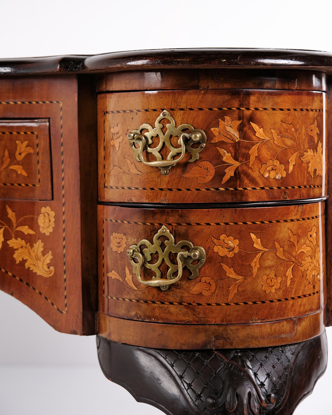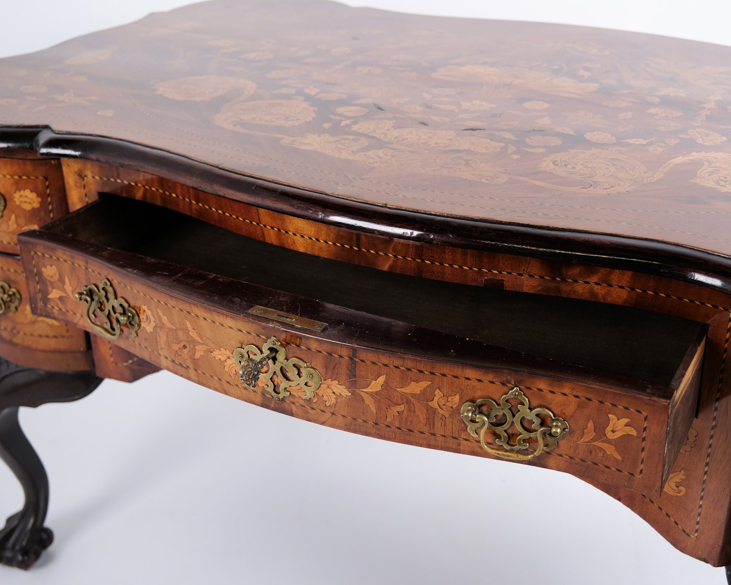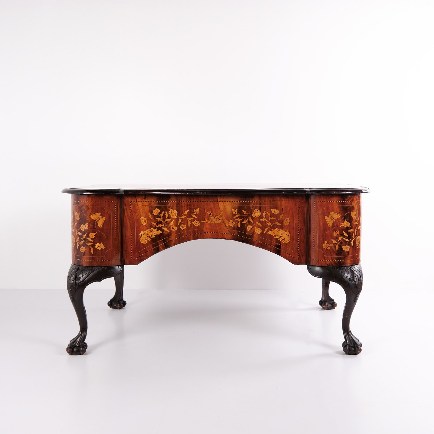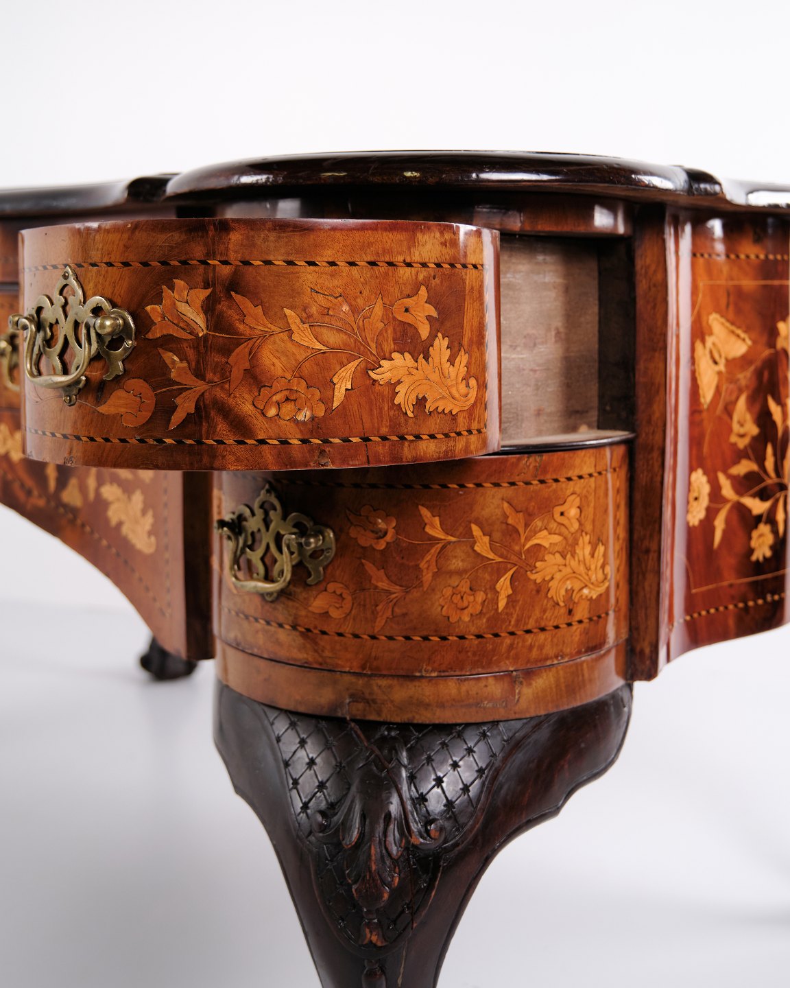 Skrivebord fra ca. 1860, udført i nøddetræ med detaljeret frugttræ-intarsia på både top og sider. Bordet er håndpoleret med shellak, hvilket giver en dyb glød og fremhæver det fine håndværk. Et elegant antikt møbel med rige dekorationer og solide materialer.