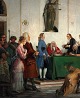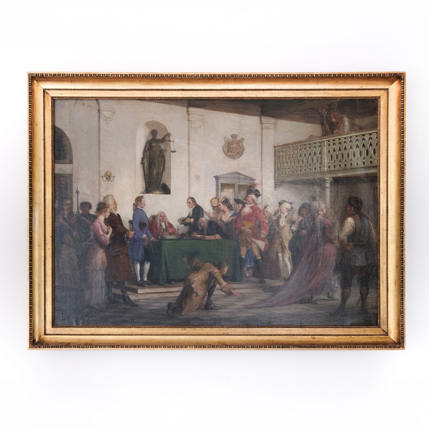 Kontakt os vedrørende prisOlie på lærred tilskrevet Wilhelm Marstrand (1810–1873), udført som en scenisk fremstilling af afslutningen på Ludvig Holbergs komedie “Det Lykkelige Skibbrud”. Maleriet er usigneret og måler 95 x 135 cm. Ny Carlsberg Glyptotek ejer en anden version af motivet (90 x 127 cm), hvor både interiør og de afbildede personer adskiller sig fra dette eksempel. Nivaagaard ejer desuden en skitse til scenen, som viser både ligheder og variationer i forhold til de to malede versioner.