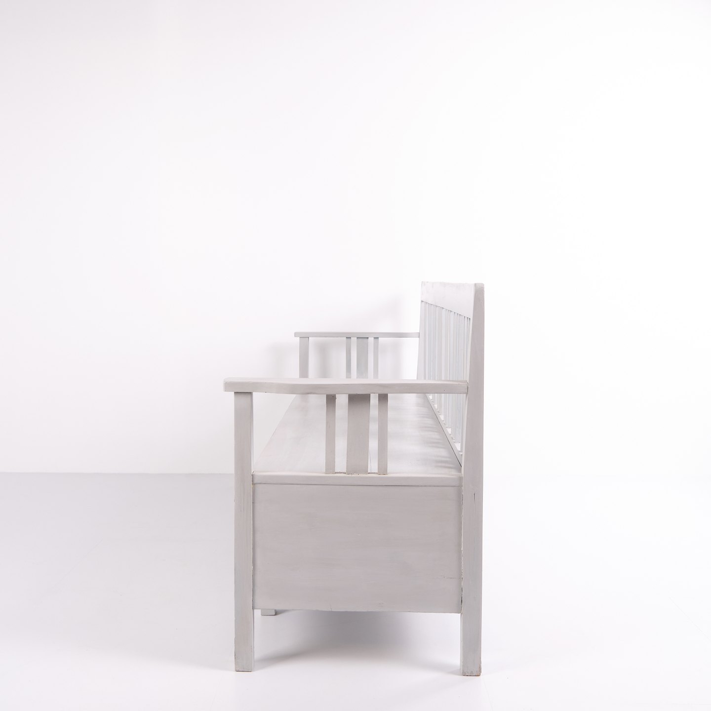 Svensk slagbænk fra ca. 1860’erne, udført i fyrretræ og gråmalet i senere tid. Klassisk skandinavisk møbel med dekorative bemalinger og praktisk sidde- og opbevaringsfunktion. Et solidt antikt stykke med tidstypiske detaljer.