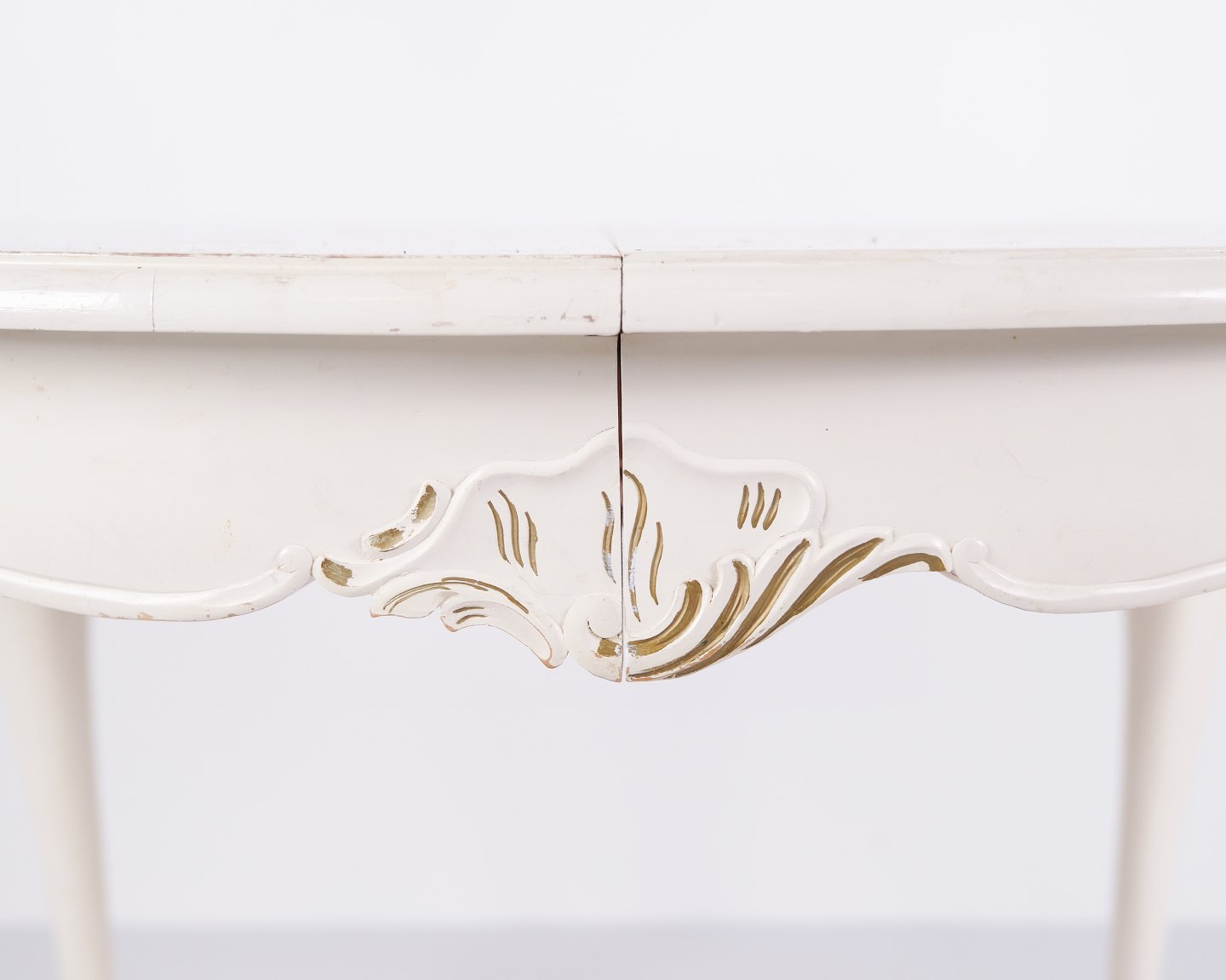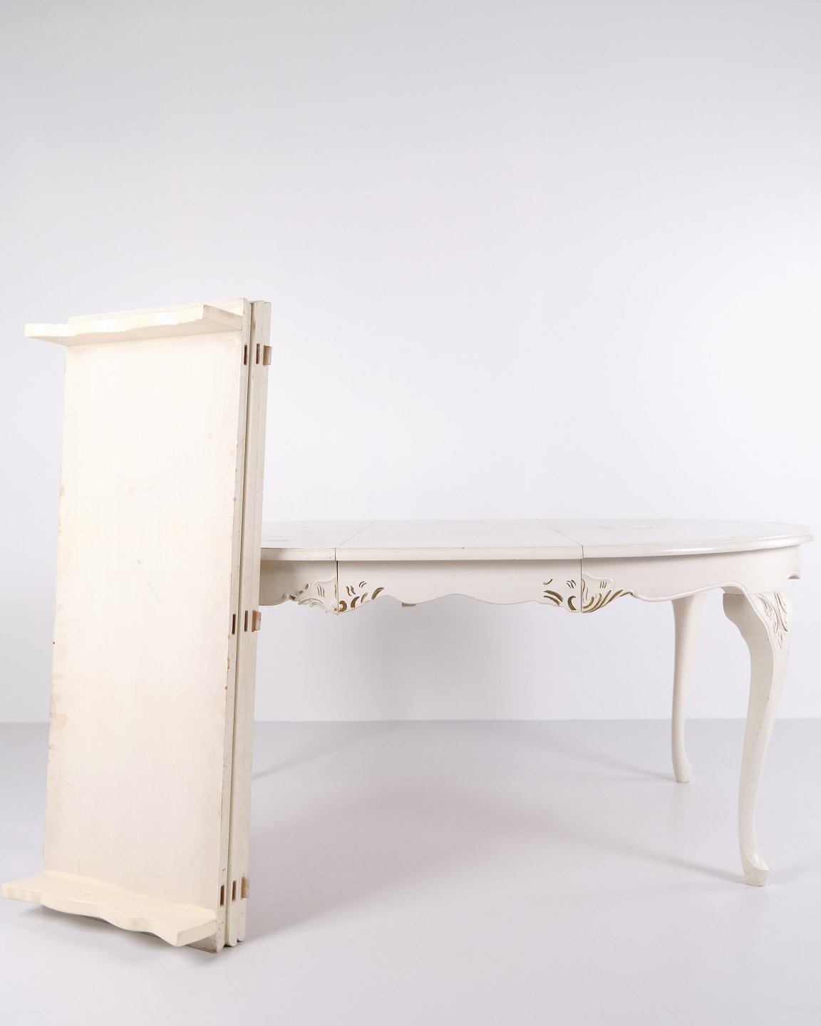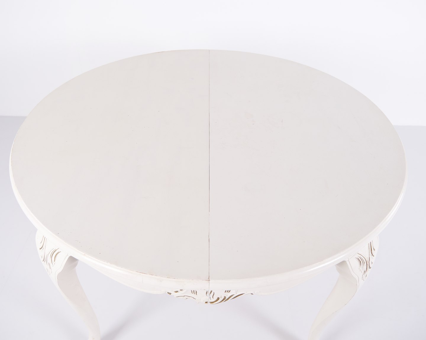 Antikt rundt spisebord i ny rokoko stil fra 1920’erne. Hvidmalet med dekorative detaljer og 4 tillægsplader.