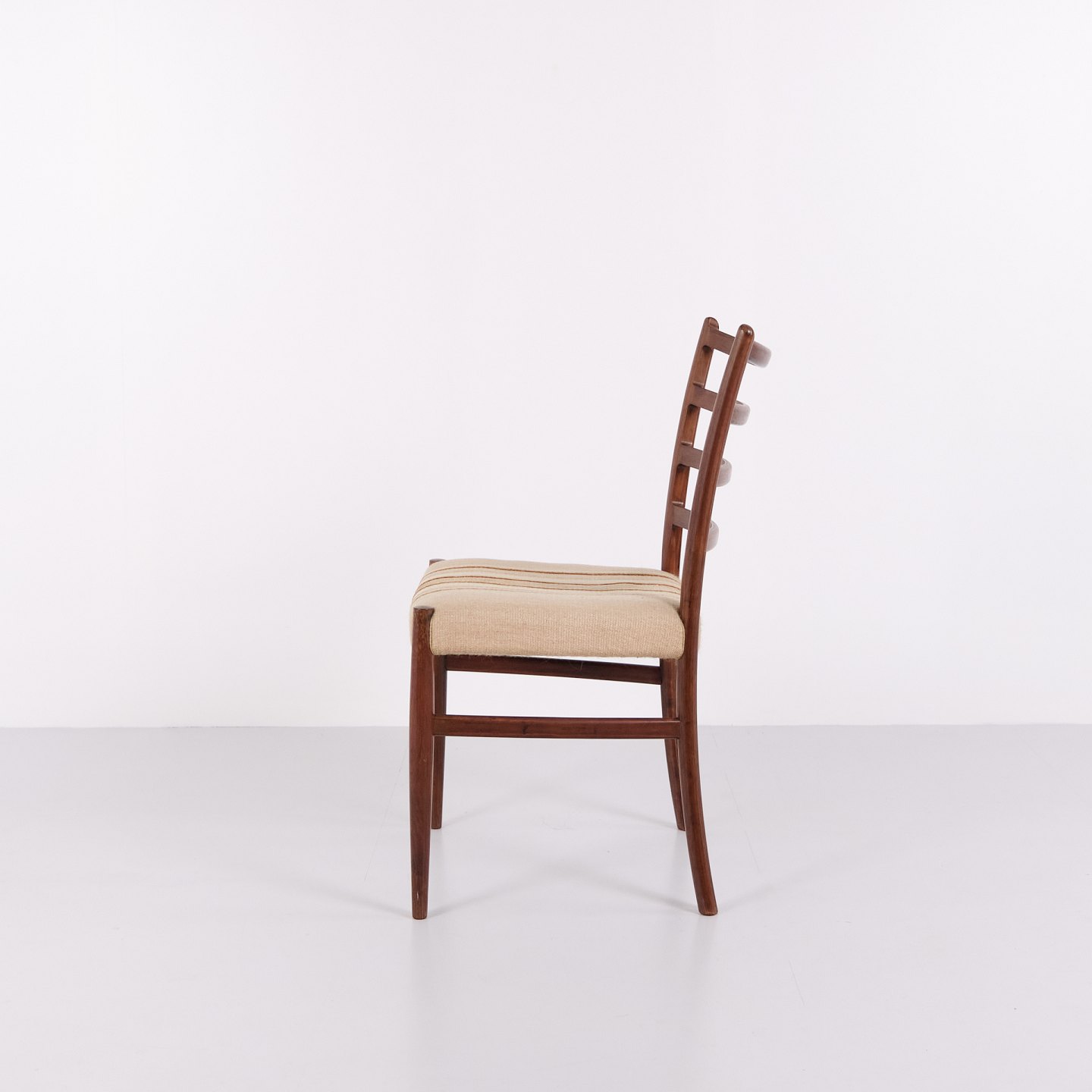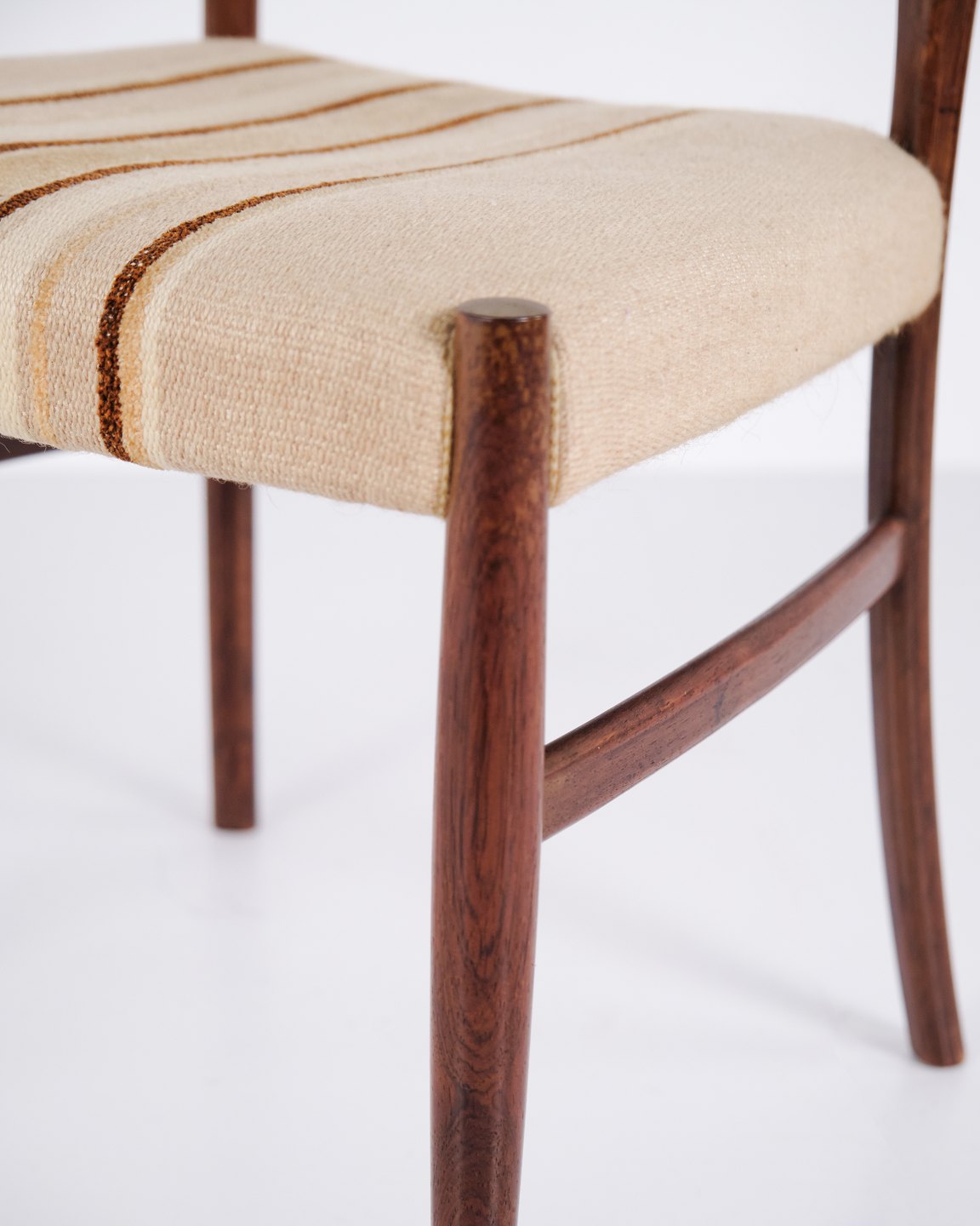N.O. Møller spisebordsstole i palisander med stribet polster fra 1960’erne. Design af J.L. Møllers Møbelfabrik.