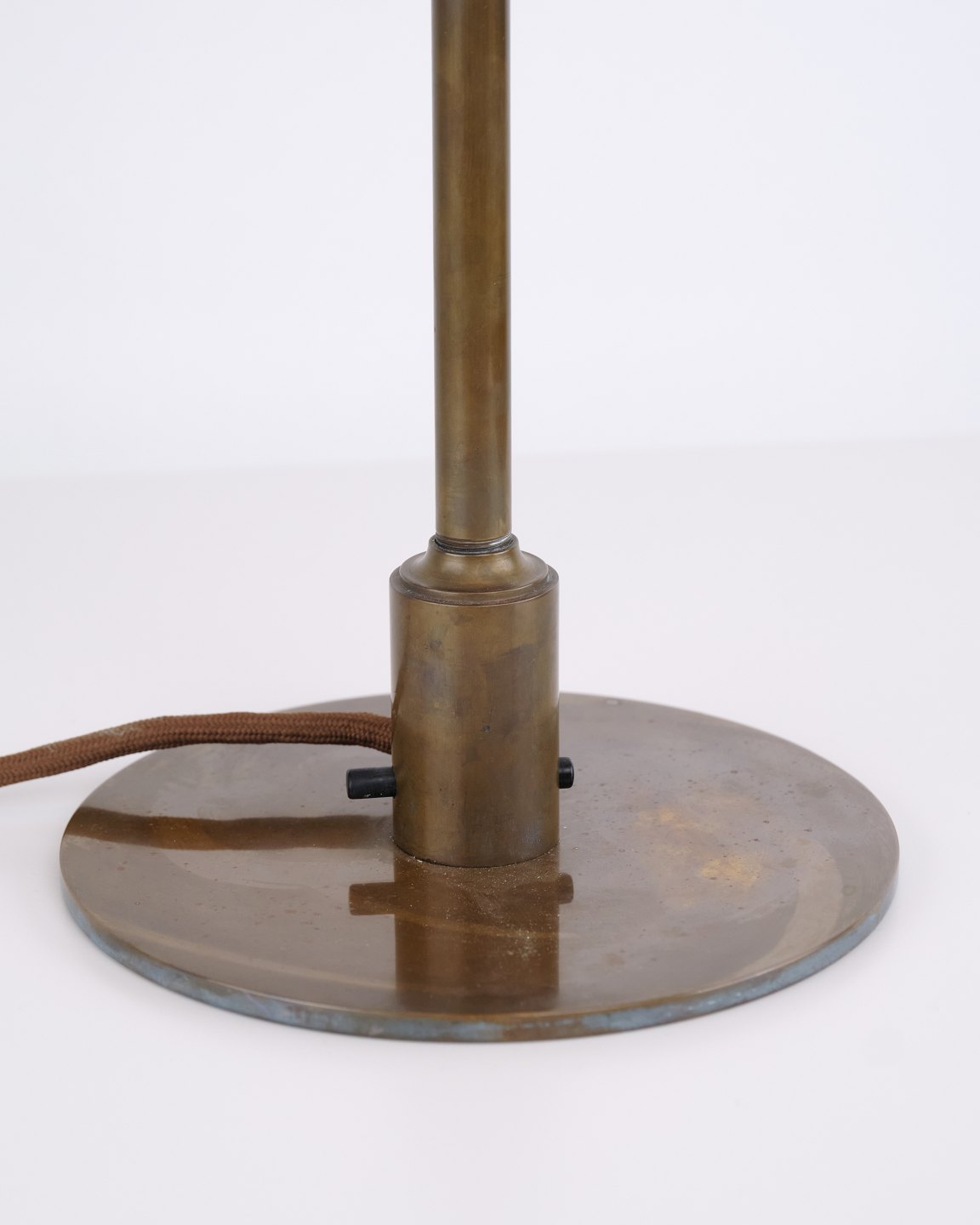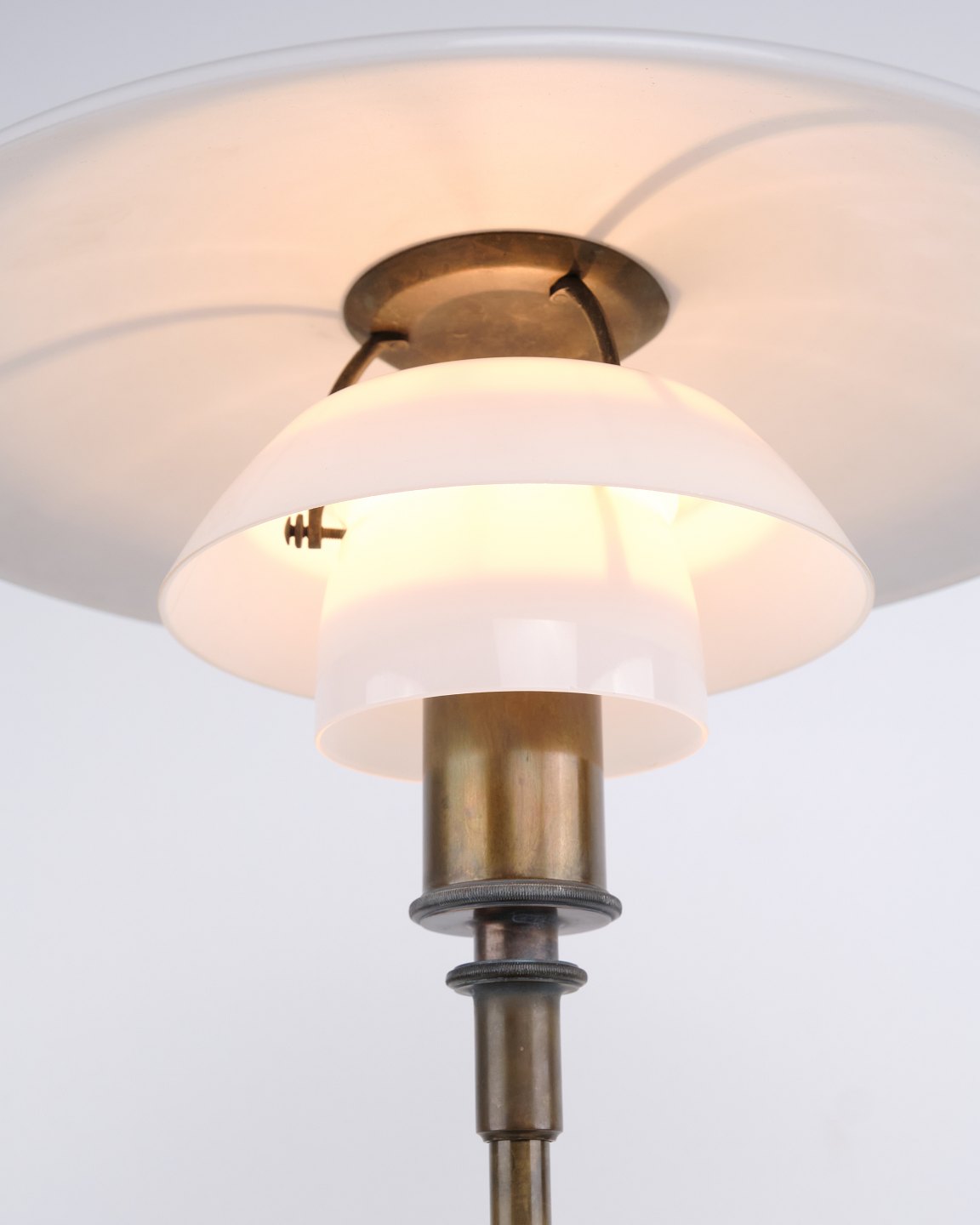 PH 4/3 bordlampe designet af Poul Henningsen og produceret af Louis Poulsen i 1930’erne. Lampen er udført i bruneret messing med skærme i hvidt opalglas, som giver en behagelig og diffust fordelt belysning.