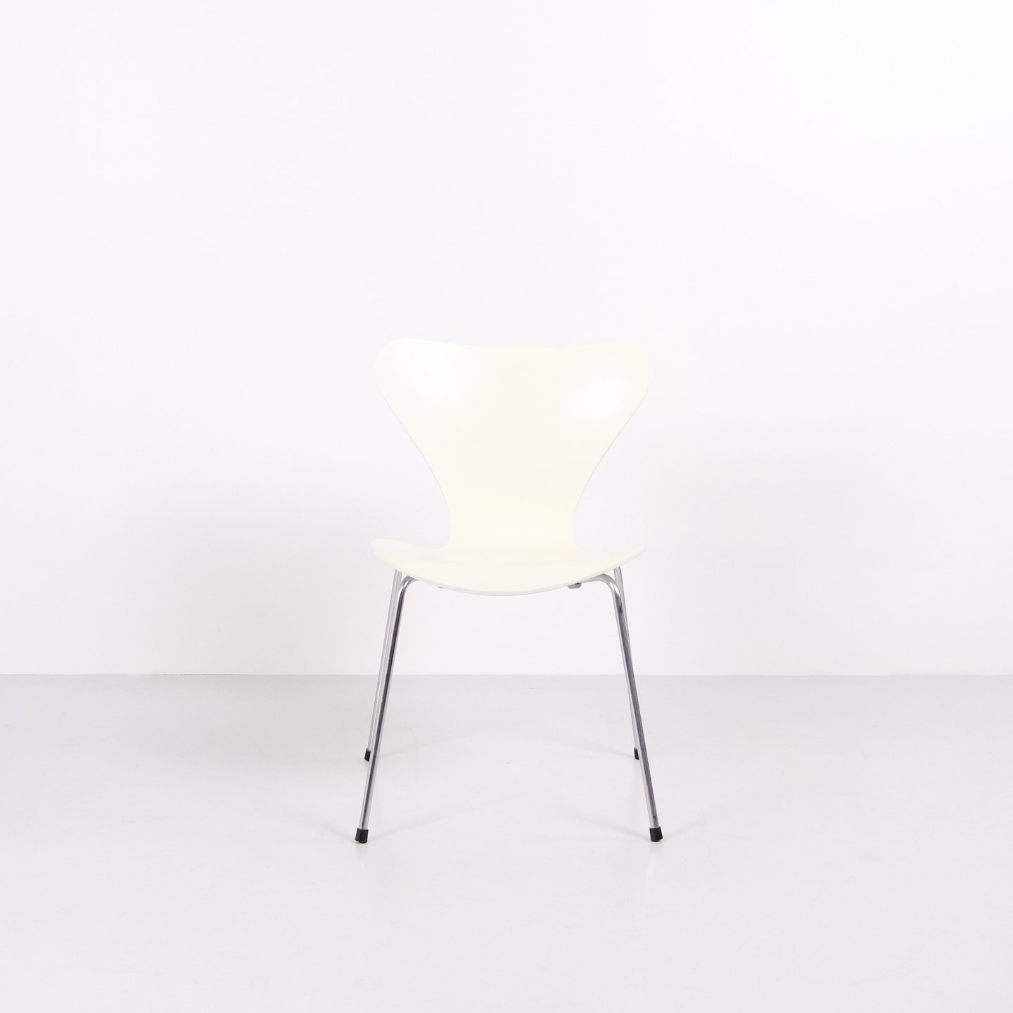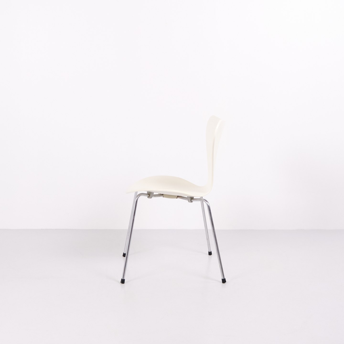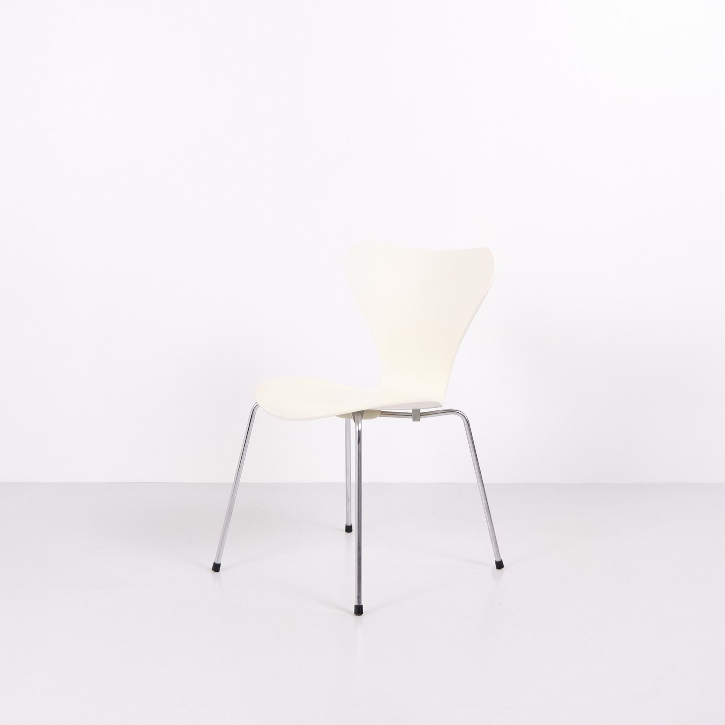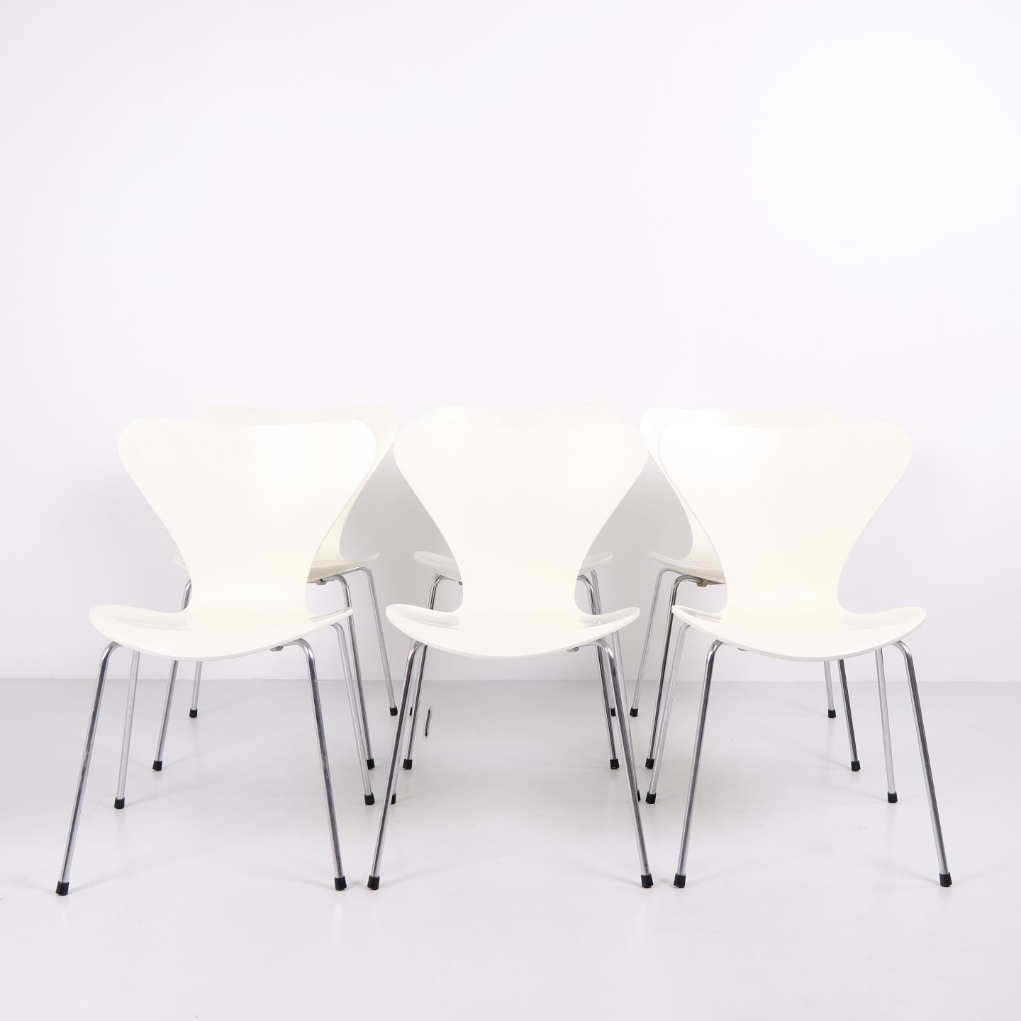 Sæt af 6 Syverstole model 3107 designet af Arne Jacobsen for Fritz Hansen. Modellen blev introduceret i 1955 og er en videreudvikling af Myren fra 1952. Stolen er udført i formspændt finér med hvidlakeret overflade og forkromet stålrørsstel. Den karakteristiske syvtalsform gjorde modellen til en af de mest producerede stole i dansk designhistorie. 3107 har været anvendt i private hjem, restauranter, kontorer og offentlige interiører verden over og produceres fortsat af Fritz Hansen. Sælges kun samlet.