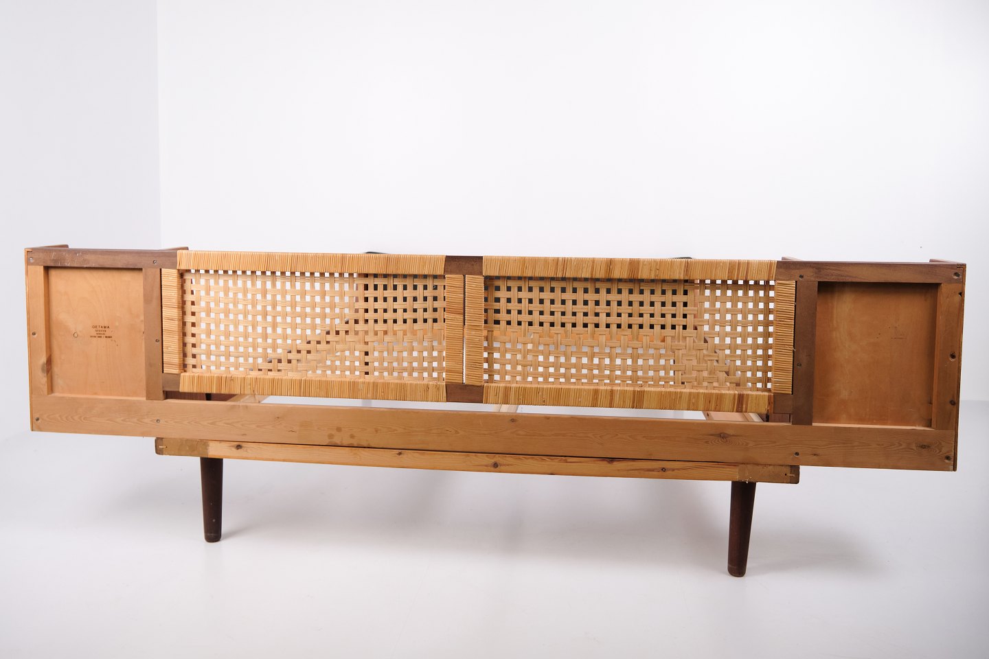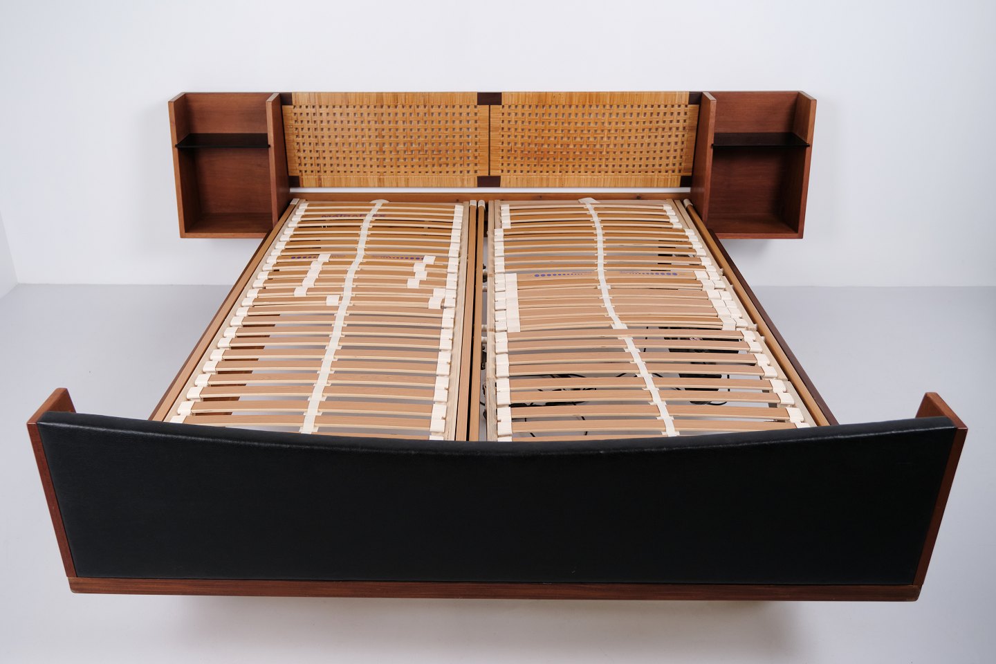 Model GE 701 dobbeltseng designet af Hans J. Wegner og fremstillet hos Getama i 1950’erne. Udført i fineret og massivt teaktræ. Gavle med sjeneflet og sort kunstlæder. Hovedgavl med integrerede sengeborde med hylder i sort glas samt underliggende hylde. Messingbeslag. Hans J. Wegner samarbejdede gennem mange år med Getama og udviklede flere møbler i teak til boligindretning og soveværelse.