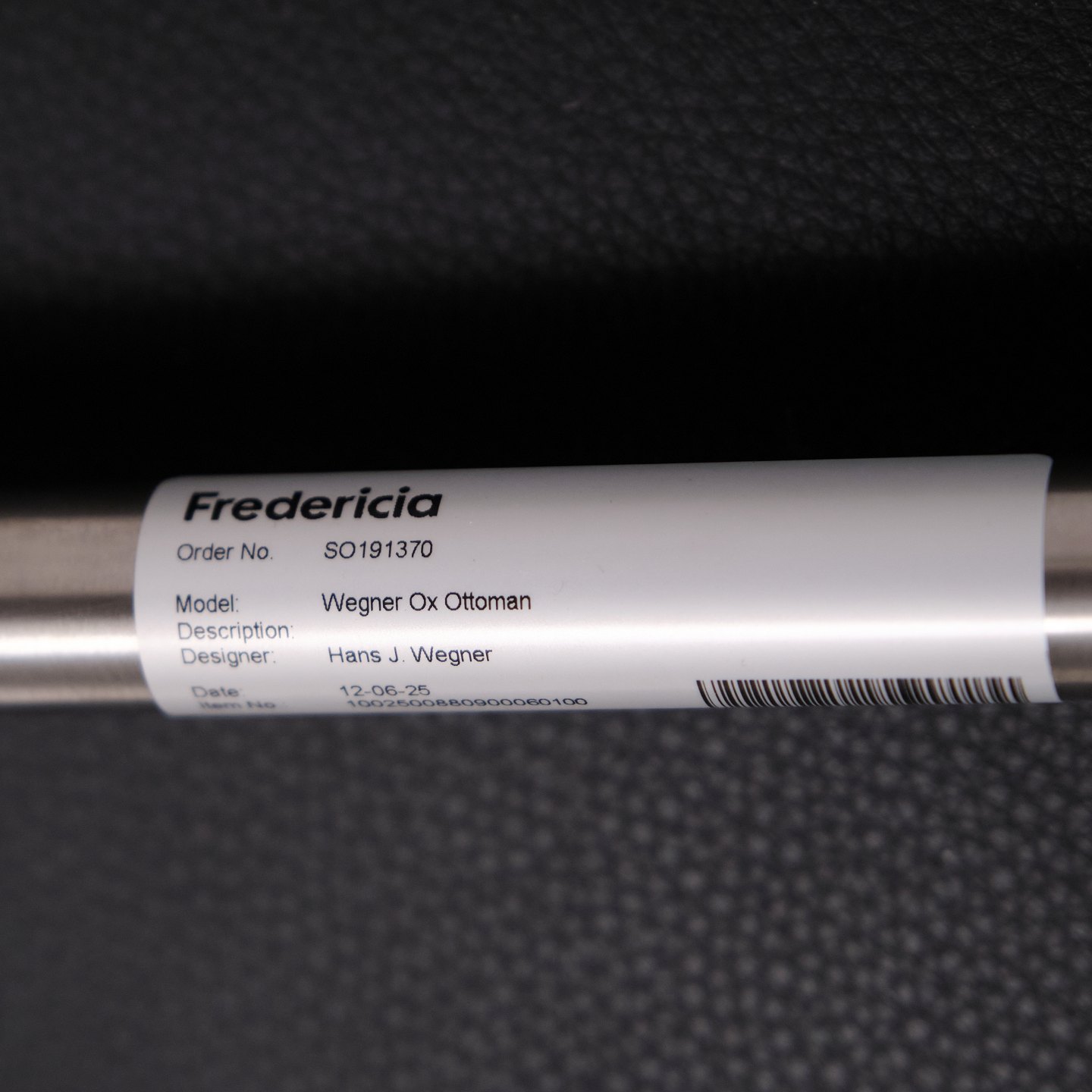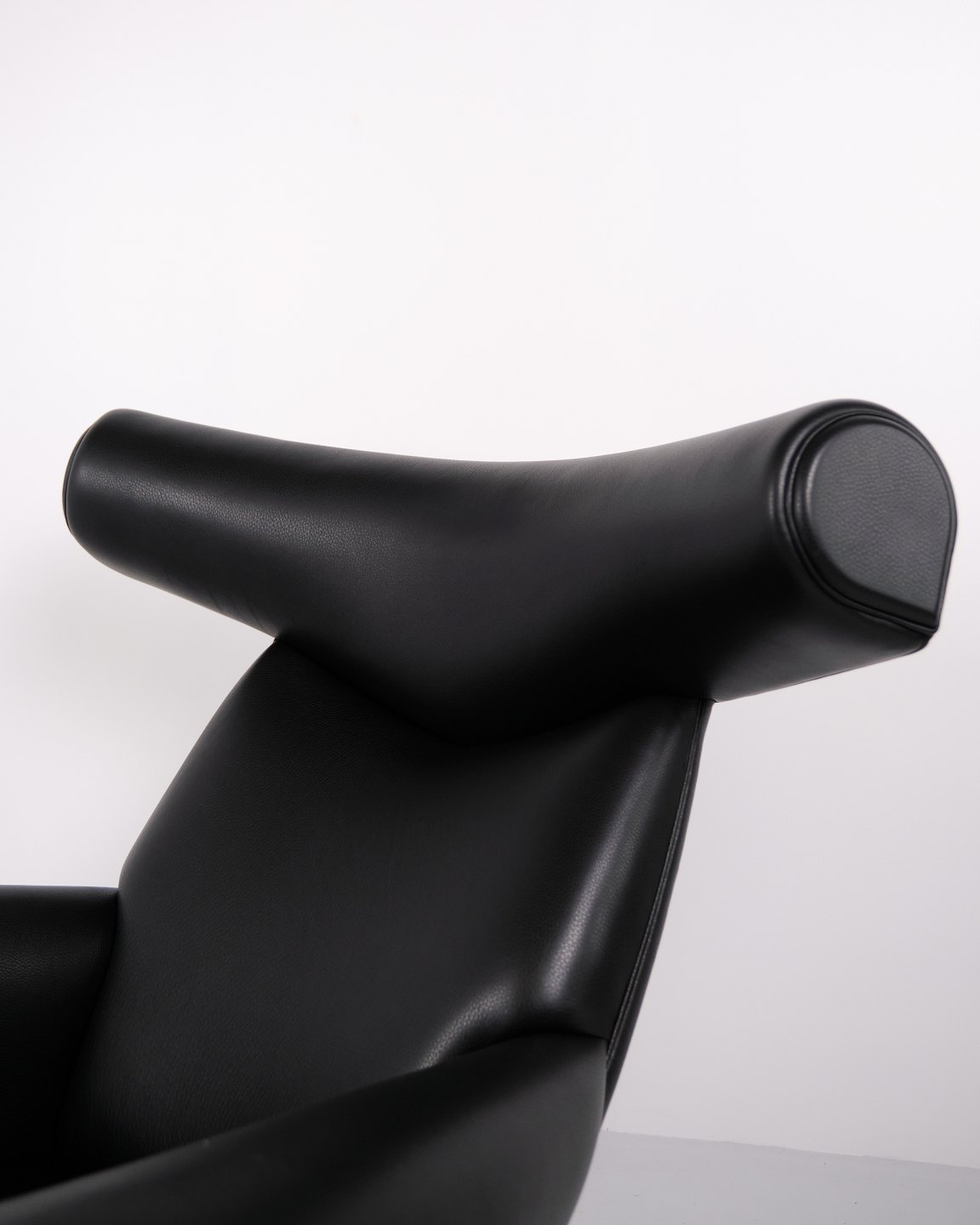 Ox Chair model EJ100 med tilhørende skammel designet af Hans J. Wegner. Modellen blev tegnet i 1960 og produceres i dag af Fredericia Furniture efter overtagelsen af Erik Jørgensen. Stolen er udført i sort læder med stel i stål. Det markante ryglæn med “horn” gav modellen navnet Ox Chair. ´