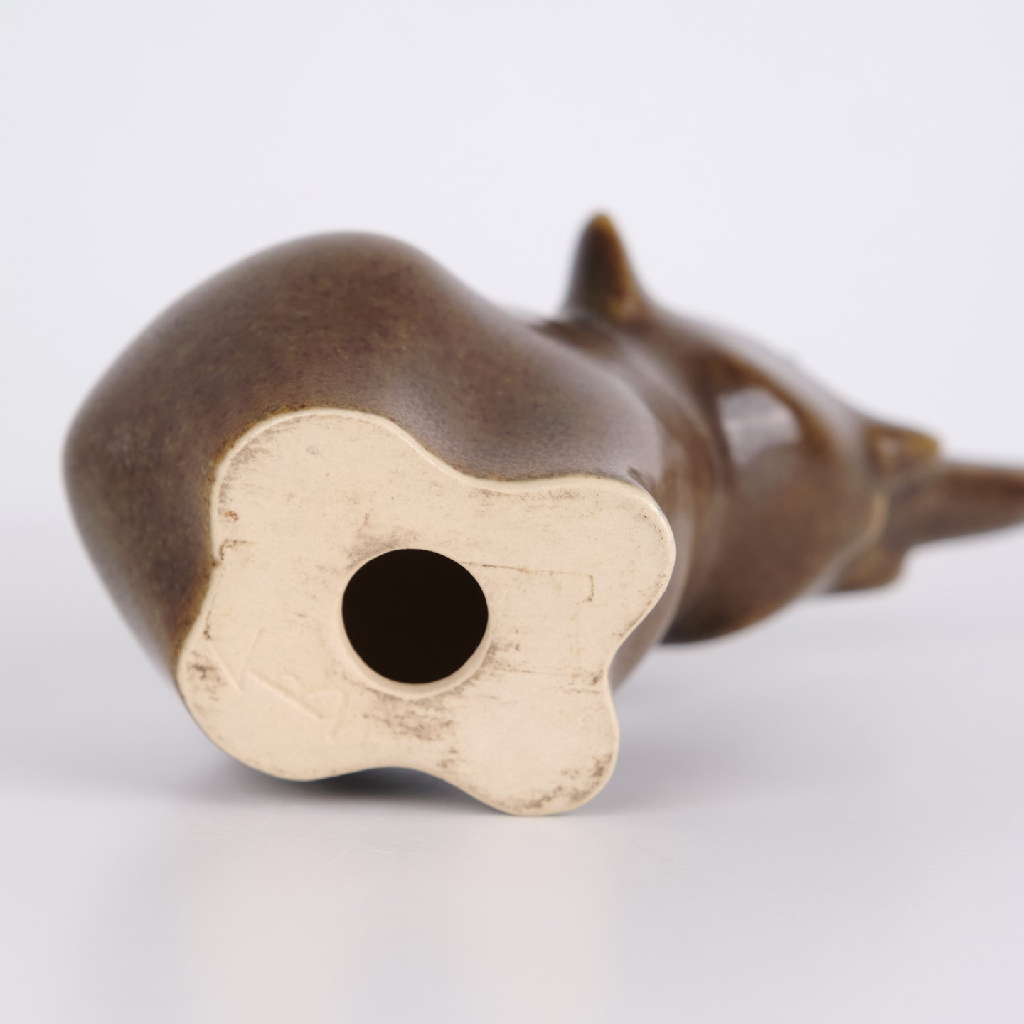 Elefantfigur af Knud Basse udført i brun glaseret keramik. Figuren er modelleret med løftet snabel og afrundede former, som giver et levende og dekorativt udtryk. Et klassisk eksempel på dansk dyrekeramik, hvor enkle linjer og karakterfulde motiver er i fokus. Eftertragtet figur blandt samlere af Knud Basse og dansk keramik.