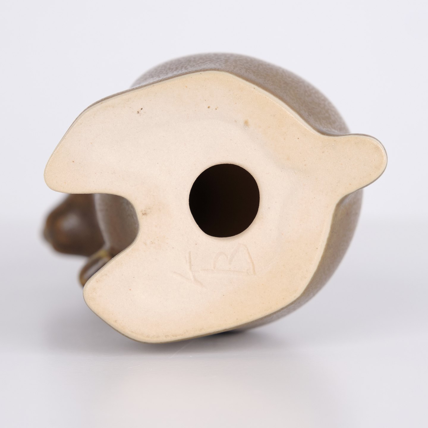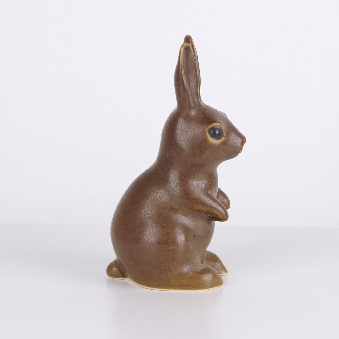 Stor harefigur af Knud Basse udført i brun glaseret keramik. Figuren er modelleret i opret siddende form med lange ører og fine håndmalede øjne.